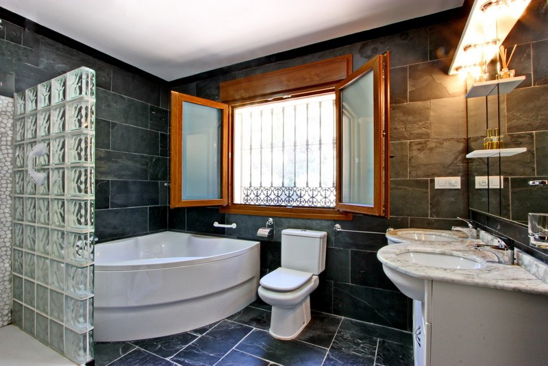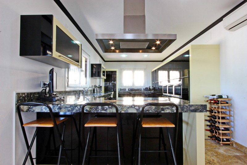 The Four Bathrooms are laid with Natural Caldera Black Pizzara Slate and contrasting Natural White Lazer-Cut Dune River Stone with contemporary Glass Block wall surrounds the shower and bath areas. The Kitchen, again handmade and created by Santiago of Beniarbeig, probably the leading specialist manufacturer, and without doubt the most expensive, on the Costa Blanca. The granite kitchen worktops are 3 inch thick Cut and Polished Natural Granite Verde Bahia block.